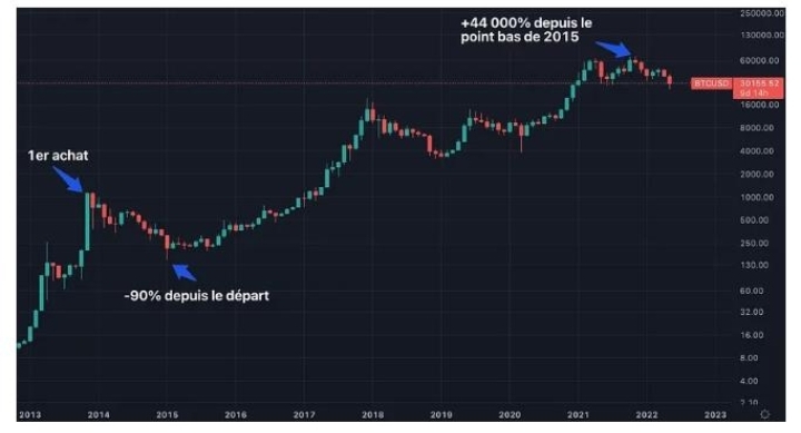 Il achète ses premiers Bitcoins au pire moment à la pointe de la bulle autour de 1 100$ en 2013.