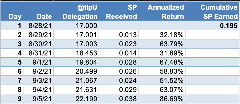 The Annualized return for the first couple of days varied greatly because I did not have enough SP delegated for the SBD payout to climb to over .001. Every other day the total would climb to over .001 and that day would show a higher return. Beginning on day 5, I was able to hit the .001 SBD threshold each day to get the full payout.
