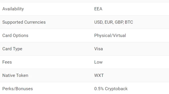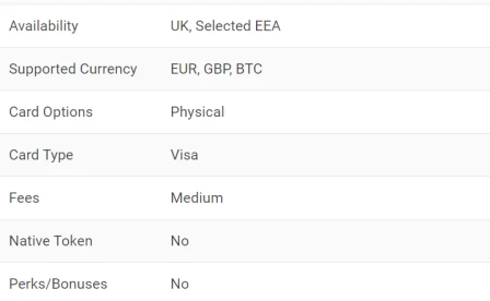 Availability UK, Selected EEA Supported Currency EUR, GBP, BTC Card Options Physical Card Type Visa Fees Medium Native Token No Perks/Bonuses No