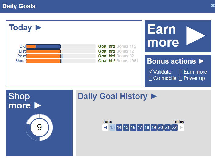 To earn your money each day, you need to achieve your goals. Those goals involve listing items for sale, bidding on items others are selling, posting on your own feed, and sharing others' posts (which, I think, involves the engagement from clicking the like button or commenting on people's posts).