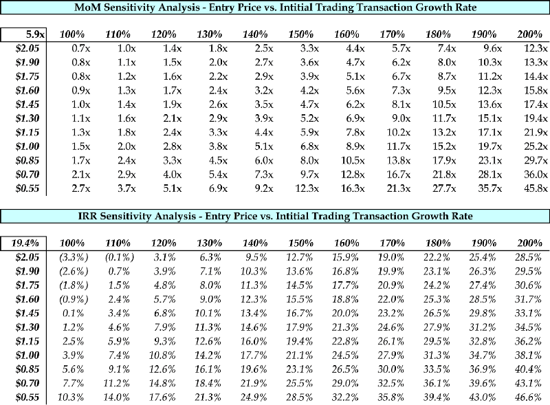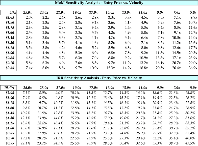 At a price of $1.30, model suggests MoMs in the range of 3–5x, with mid-teens IRR, which is relatively unattractive compared to other opportunities in HGR’s near-term pipeline.
