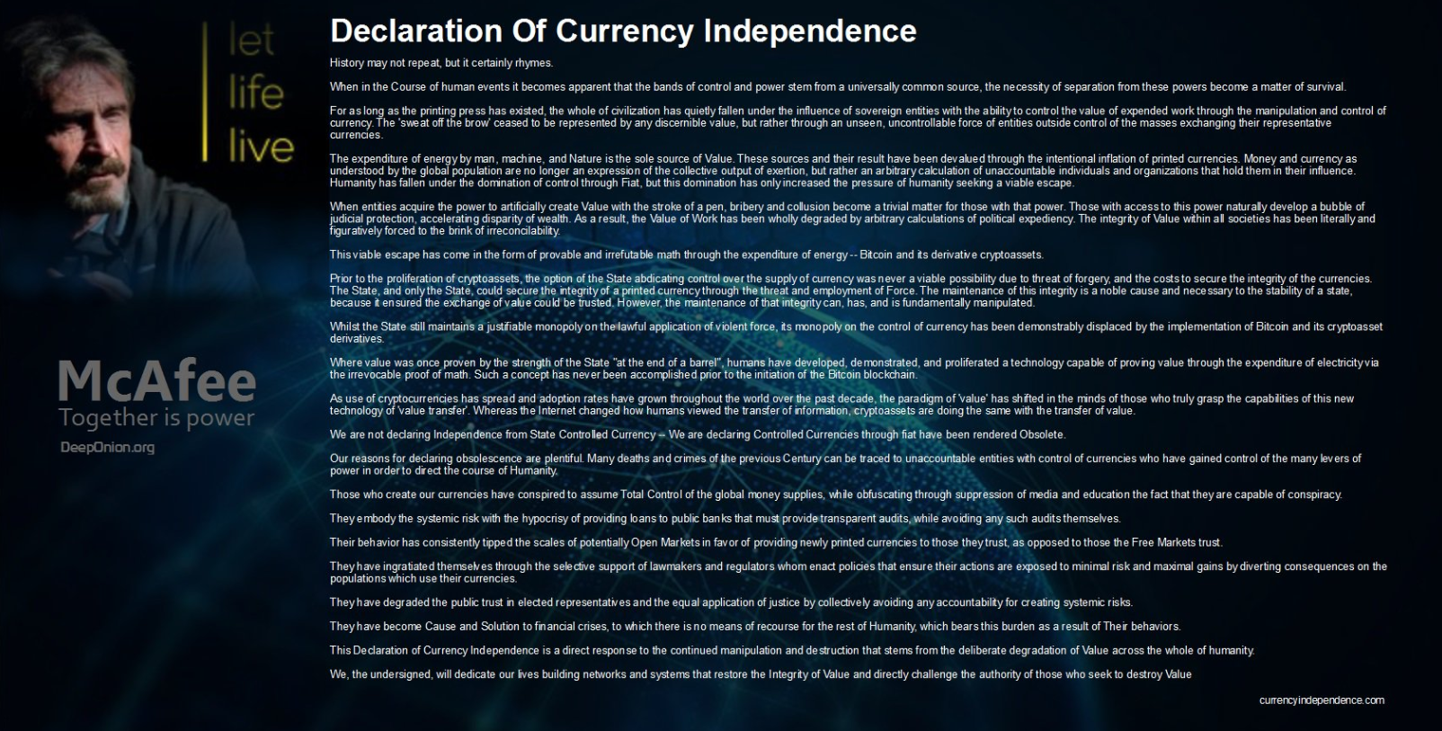 CRYPTO NEWS : John McAfee Currency Independence Movement