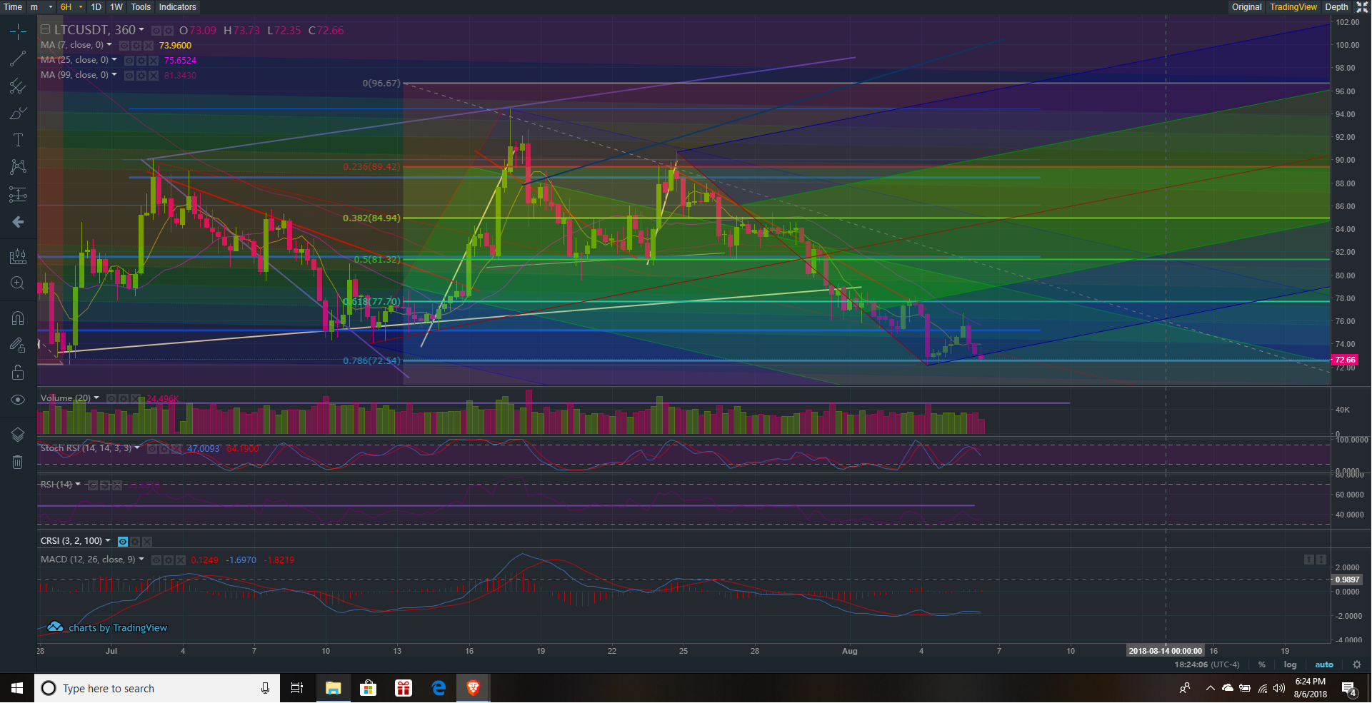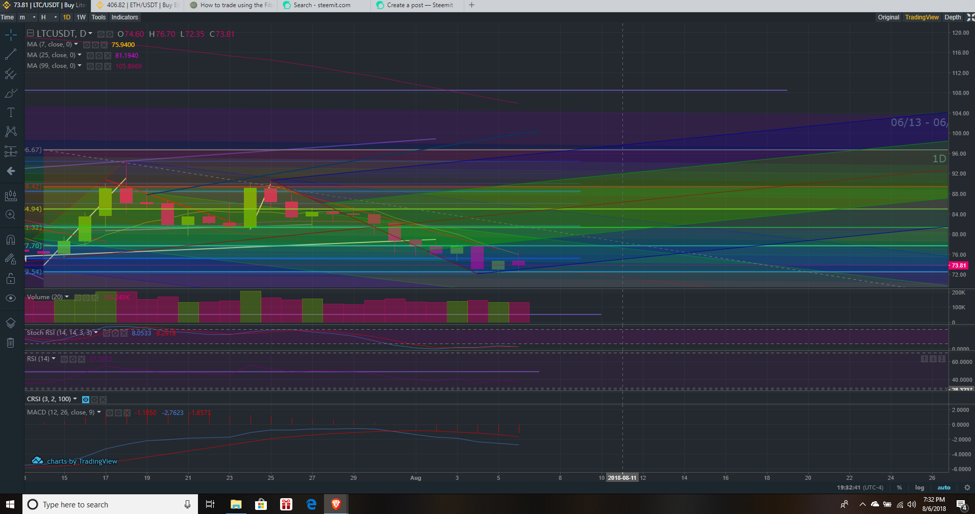 Hello, everyone! I'm pretty new to Crypto and even newer to Steemit, but I'm very excited to be a part of this community. For my first Steemit post I thought I would post a screenshot of my Binance chart for Litecoin (LTC/USDT).