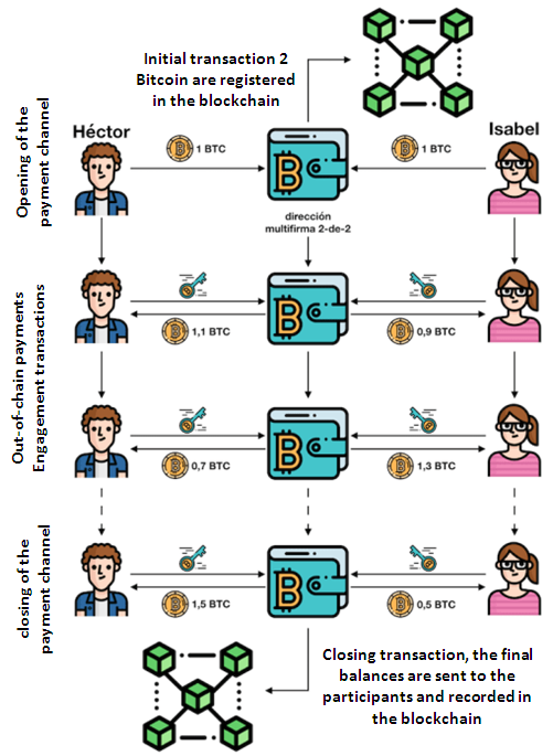 It is an intermediary operation without custody carried out outside the chain, and making use of the payment channels, basically means that 2 users can commit to make a series of payments signed by both parties in an out-of-chain address, without the need of confirmations and atomic form, the initial and final transaction is recorded in the chain as shown in figure 1.