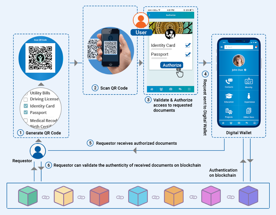 Documents can be easily shared between the requester and the user. For example, the requester needs to ask for a document. The requester will first generate a QR by selecting a type of document, such as passport, medical records, birth certificate, and so on. The user will then scan the QR code and see what specific documents are being asked for, validate the requests and approve the sharing of the documents with the requester. Thus, such authority or approval by the user will be sent over to the digital wallet and delivered straight to the requester’s device. All these will be monitored by smart contracts, under secure conditions, like this: