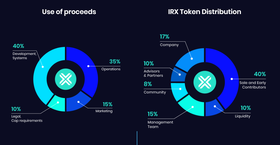 IRX is the exchange coin that will be the main coin backing the usage of the system. The users will be free to choose between paying the fees in the transaction currency or in IRX tokens. There is going to be a discount on the exchange if they pay in IRX tokens.