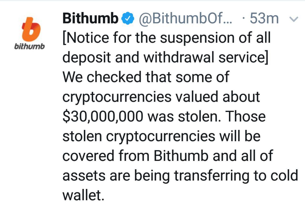 NOTICE FOR SUSPENsion deposit and withdraw servise bithumb says we checked that some cryotp currencies valued about $ 30.000000 was stolen those crypto currencies covered from Bithumb and all of assets are being transfarming to cold wallet , tell me guys what is your opinion .jpg)