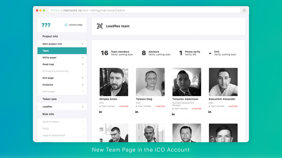 https://neironix.io is ready to release a new version of the Team page in ICO accounts. The new version is going to have new features that will give a deeper insight of projects’ teams. The changes will primarily target the validity of identities featuring on the list of team members.