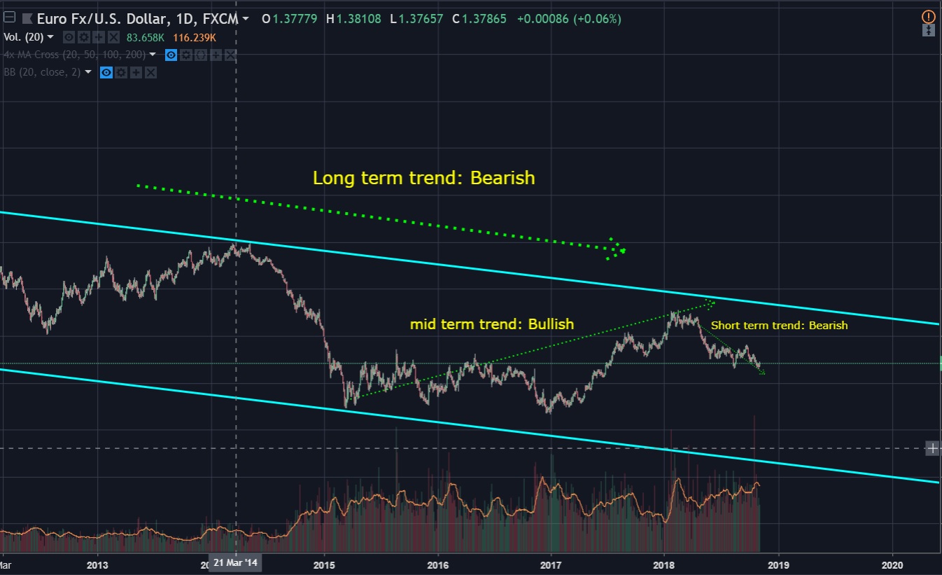 As you can see in the pair EUR/USD, there is a bearish long term trend, so basically if you have no time to expend trading you can short it and forget bout it. If you wanted to trade in a monthly timeframe, you could open a long possition and wait. In further post i'm talking about resistences and supports and how you can use them as stop-loss or take profit areas.