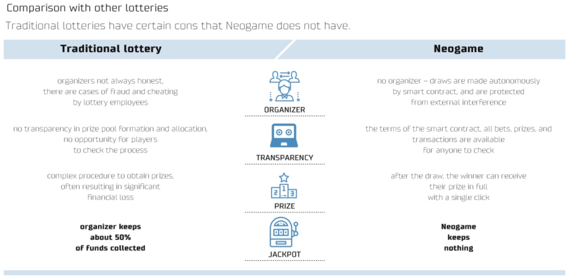 - Self-Overseeing: In light of Ethereum sagacious contracts, the lottery will exist as long as blockchain exists. It doesn't require joined organization; it will amass resources from tickets sold and scatter them all among champs as demonstrated by a sensible and clear count. Neogame won't serve any beneficiaries: nobody approaches its backings other than by viably hypothesizing WINNING lottery numbers.