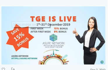 Asure network is in the market presently offering their token to the public during their official token generation event (TGE). The event commenced on 1st December 2019 at the rate of 1 ASR to $1.00 and the total value is 100, 000,000 token with intending hard cap of $40,000 000. ASR is ERC20 compatible token. Join this great project with an abundance of innovations and invest here for a better tomorrow.