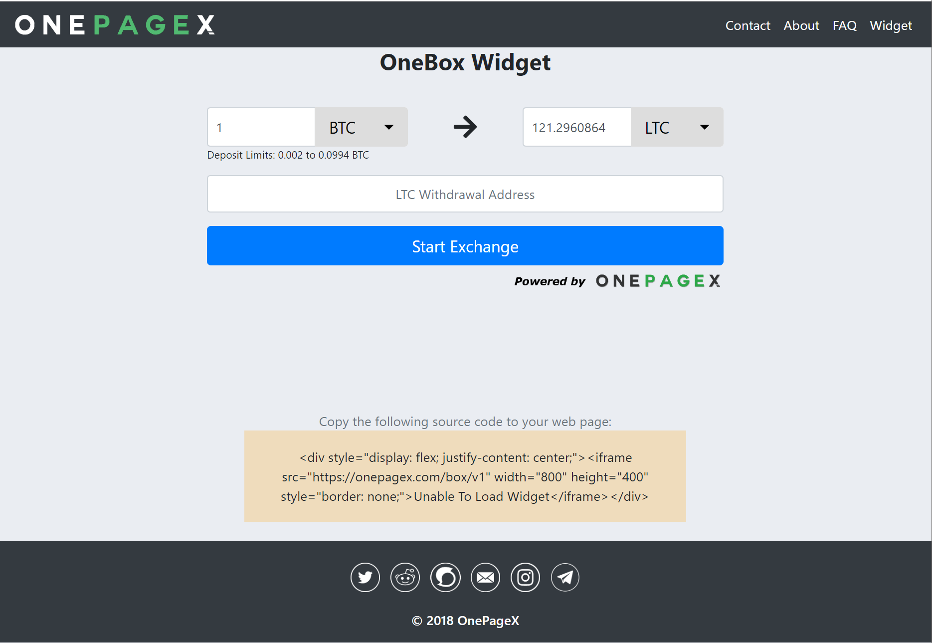 OnePageX has a portable code that can easily be installed and executed by users. This widget enables users to perform quick cryptocurrency exchange. This widget operates like OnePageX itself