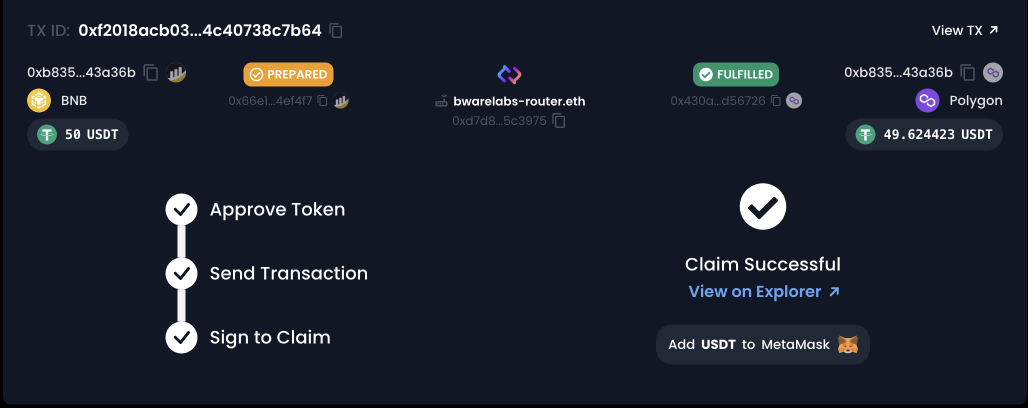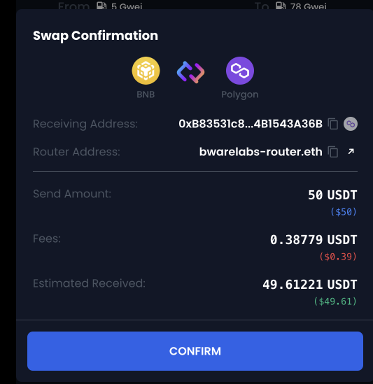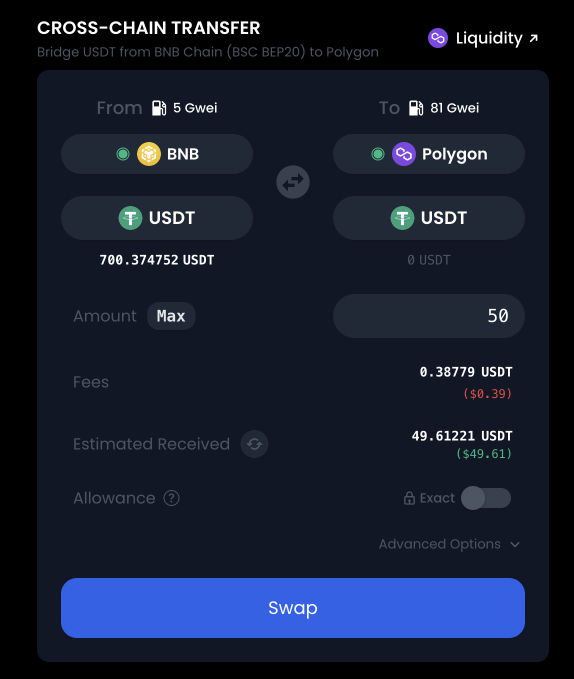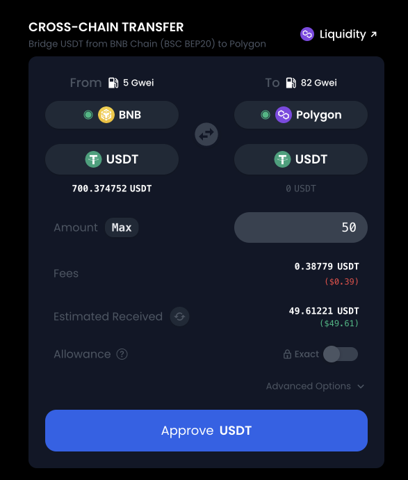 Now you are ready to use the main functionality of the crosschain-bridge, transferring cryptocurrencies from one network to another. In my guide, we will transfer USDT tokens in the BSC network to USDT tokens in the Polygon network