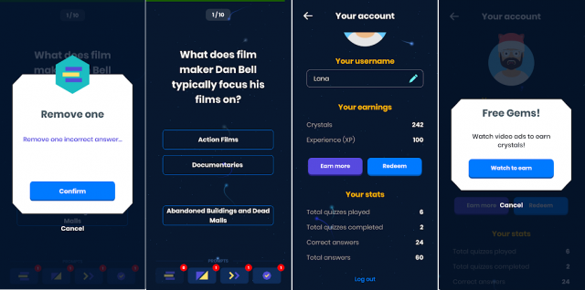 The game is described as: “Quiz game with thousands of questions on various topics. You choose the quiz length and difficulty. Beat others in global and local competitions! Earn crystals and spend them in-game.”
