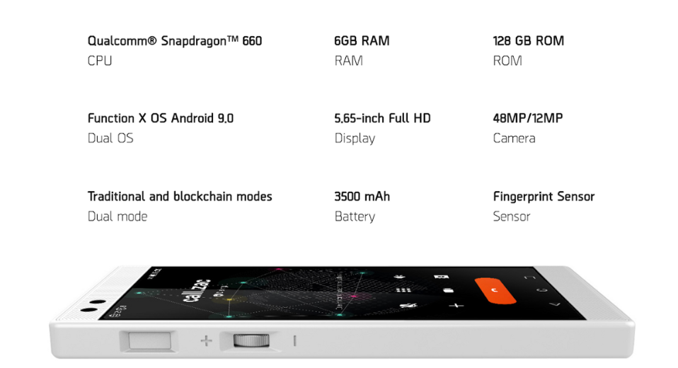 Устройство, которое взаимодействует с Blockchain обязано обладать мощными характеристиками. У BOB следующие характеристики: процессор Qualcomm Snapdragon™ 660, объем оперативной памяти 6 Гб, размер внутренней памяти 128 Гб, аккумуляторная батарея емкостью 3500 mAH, фронтальная камера 16 мегапикселей, а тыловая 48 мегапикселей.