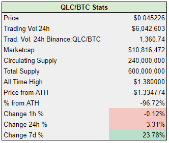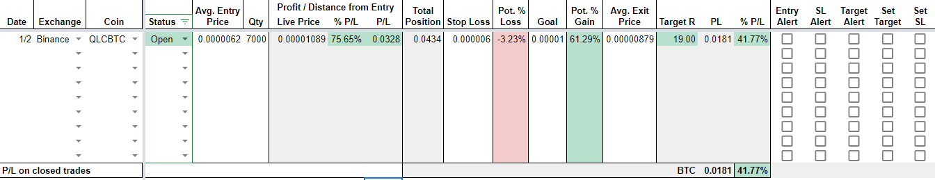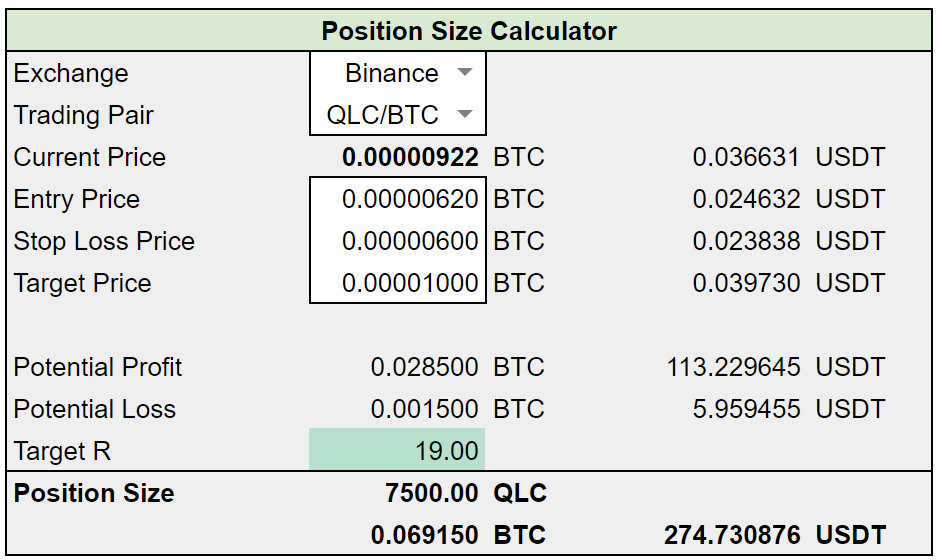 In this example, I selected the QLC/BTC pair on Binance. Entry, Stop and Target as above.