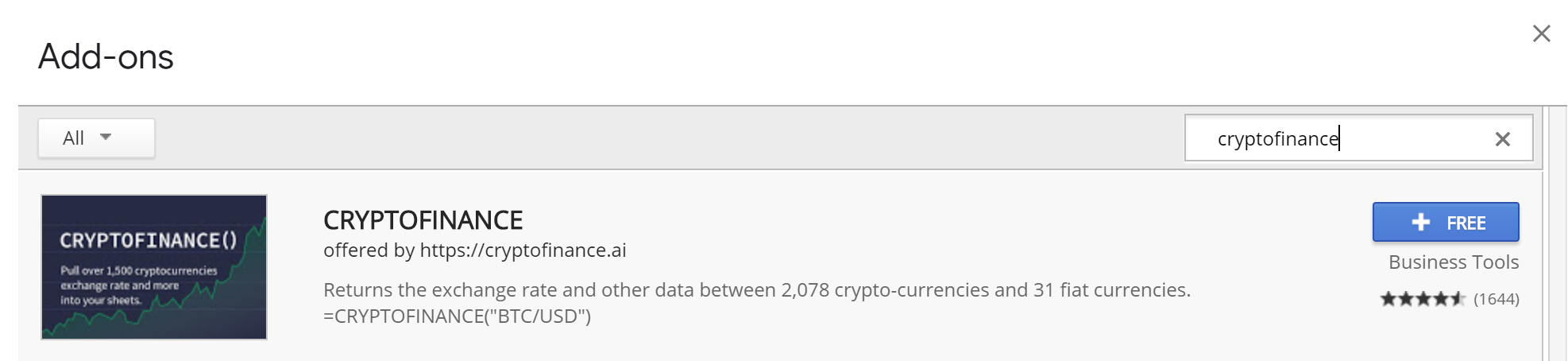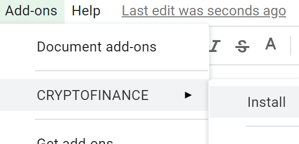 In order to get real-time crypto data, you will need to install the CRYPTOFINANCE Google Sheets add-on.