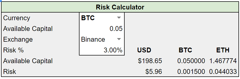 Start by selecting the currency you wish to trade with, you can choose between BTC, ETH & USD. For this example, we will go with BTC. The Available Capital will depend on your trading strategy, I wouldn't recommend putting your entire available balance in here as that's poor risk management. For this example, we are using a small percentage of our total available capital.