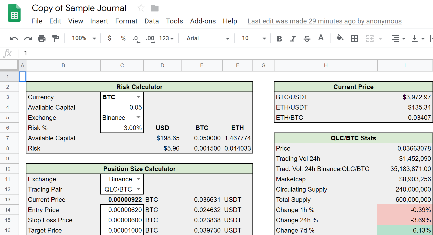 The purpose of this journal is to assist you to calculate your risk, track the progress of current open trades and help you identify what does/doesn't work for you. Most importantly, my aim is to reduce some of the pain in planning and executing trades, freeing your time to analyse charts. This journal is still a work in progress, this version supports Binance, BitMax*, Bittrex, Huobi, Kraken, Kucoin & Poloniex but I have only included BTC and ETH pairs in the journal tabs. I plan to add more exchanges and pairings in future versions.