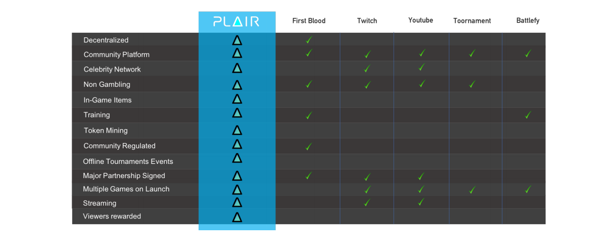 Plair believes that in order to become a successful platform, we need to include more community features as well as allowing users the rare opportunity to interact with celebrities and professional gamers. This makes the platform fun and keeps users coming back for more. Below are some comparisons with centralized and decentralized eSports tournament platforms: