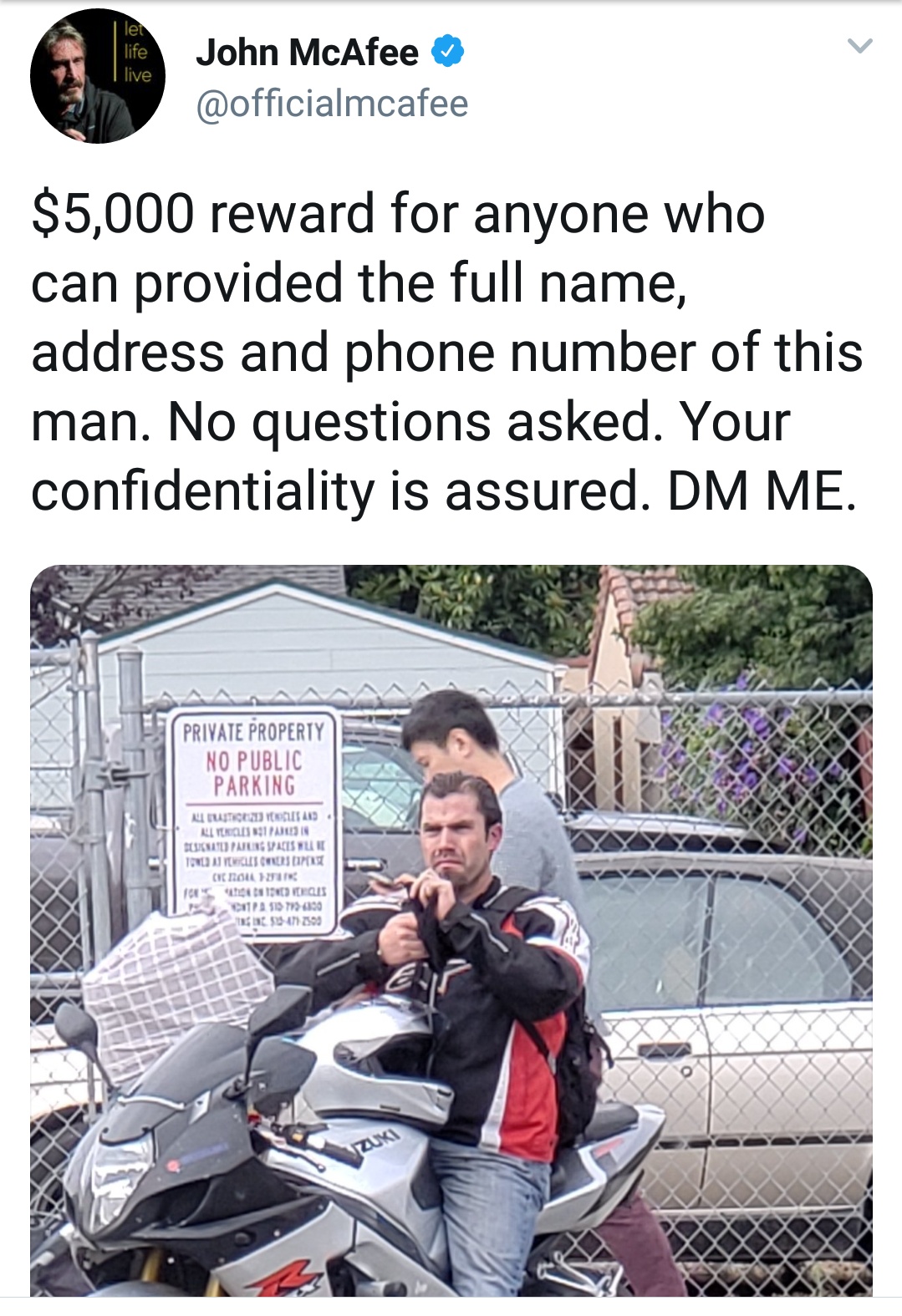 McAfee wants public help to find a person. Here's the tweet that he wrote.