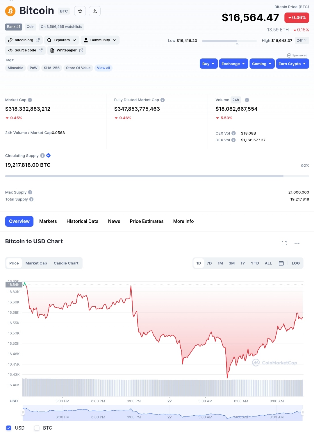Bitcoin price today is $16,564.47 USD with a 24-hour trading volume of $18,082,667,554 USD. BTC to USD price in real-time. Bitcoin is down 0.46% in the last 24 hours.