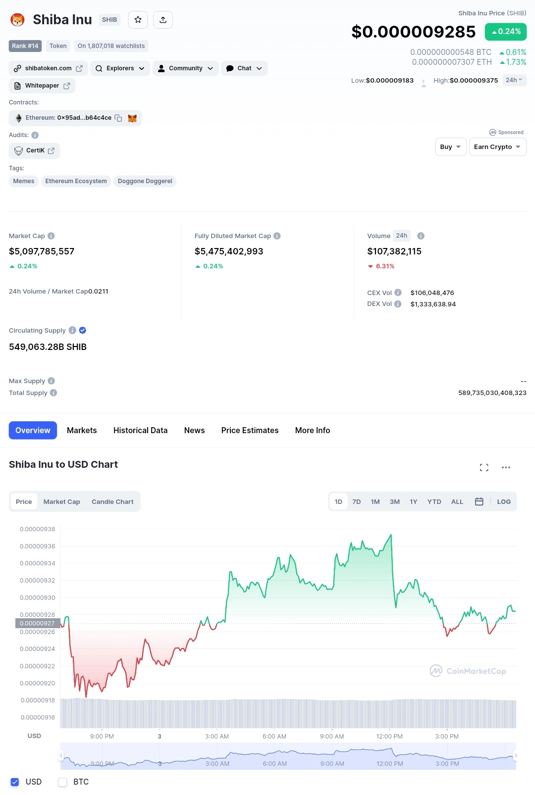 Shiba Inu price today is $0.000009 USD with a 24-hour trading volume of $107,382,115 USD. SHIB to USD price in real-time. Shiba Inu is up 0.24% in the last 24 hours.