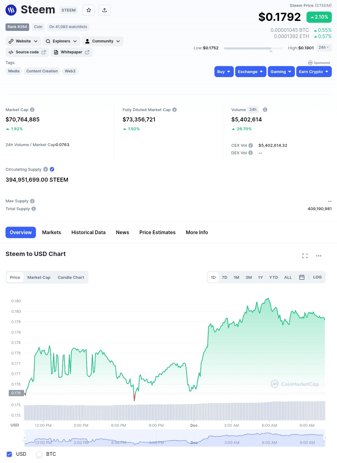 Steem price today is $0.179861 USD with a 24-hour trading volume of $12,135,583 USD. STEEM to USD price in real-time. Steem is down 0.95% in the last 24 hours.