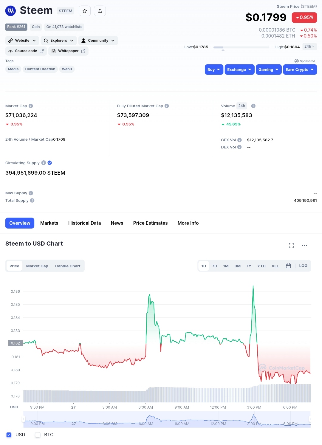 Steem price today is $0.179861 USD with a 24-hour trading volume of $12,135,583 USD. STEEM to USD price in real-time. Steem is down 0.95% in the last 24 hours.