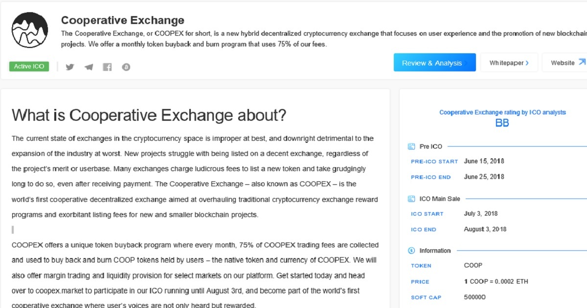 The Cooperative Exchange Token (COOP) is the native COOPEX platform token. Every month, 75% of COOPEX trading fees will be collected and used to buy back the COOP token and burn it. The token will be bought on the actual COOPEX market at market price and we will not perform any OTC trades. The COOPEX ICO will raise a maximum of $950,000 (this is the hard cap The soft cap is $500,000