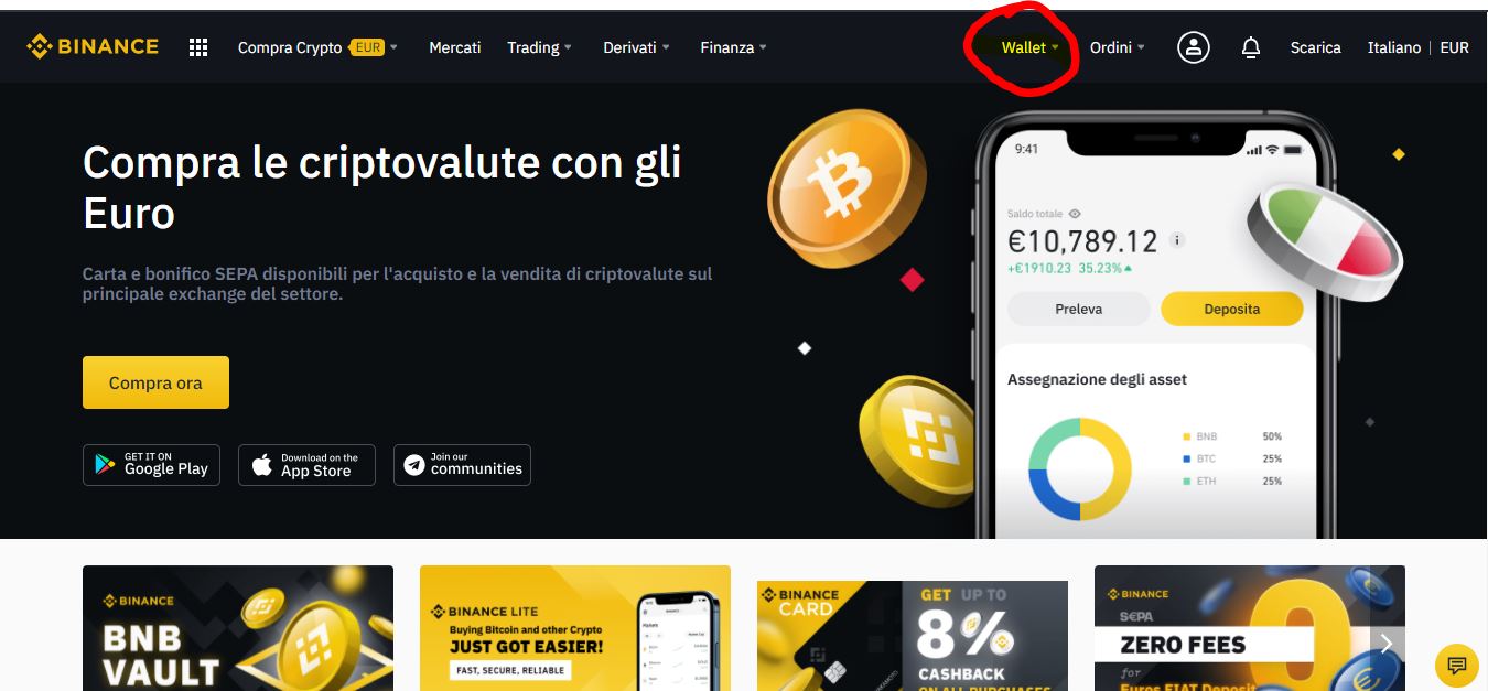 Per prima cosa entriamo nel sito e posizionandoci su Wallet