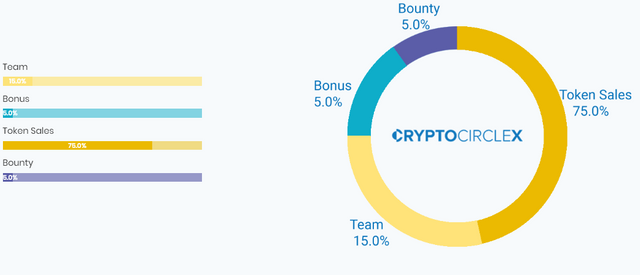 The CCX token has a total amount of 300 million, and will eventually go down to 150 million CCX tokens. 10 % will be burned every 6 months until the burning program is completed in 6 years. The token allocation will be 75% will go to the token sale. 5% will go toward bounty. 5% will go towards bonuses. 15% will go to the Crypto Circle X team. The funds raised from the ICO go towards operations, marketing, legal fees, and development—with the bulk going to development and operations.