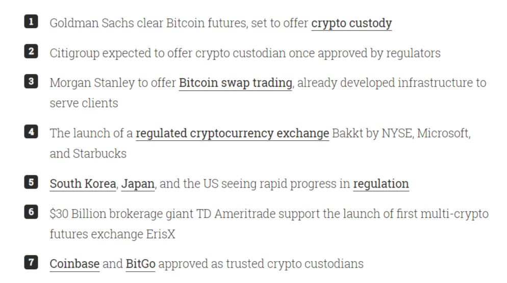 Finally, the FATF has pushed back its framework for crypto AML regulation to be released by June 2019, leaving plenty of breathing room for the market to develop and appeasing the threat of a regulatory crackdown on the crypto industry.