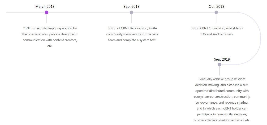 Innovation in the CBNT community: participating is mining;100% profit exchanging; community autonomy model; practicing decentralized self-operation management “group wisdom”. All participants in this ecosystem can get 100% corresponding rights and benefits, thus to achieve a win-win system of "content, traffic, and advertising."