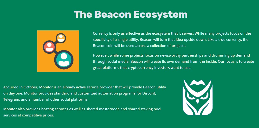 I divided the Beacon project into two section, one is the masternode which is a passive income opportunity for investors and the other one is the development of Beacon, where other developers will be able to implement everything they need to make a successful startup from planning and execution of their concept.