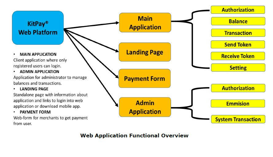 The kitpay web platform is further divided into: Main Application taking Authorization, Balance, Transaction, Send Token, Receive Token & Settings and Admin Application taking Authorization, Emission, System Transaction. main Application typically contains client Application where only registered users can login. The admin Application typically contains Application for administrator to manage balances and transactions. The landing page or standalone page contains information about application and links to login into web application. The payment form or web form are for merchants to get payment from users.