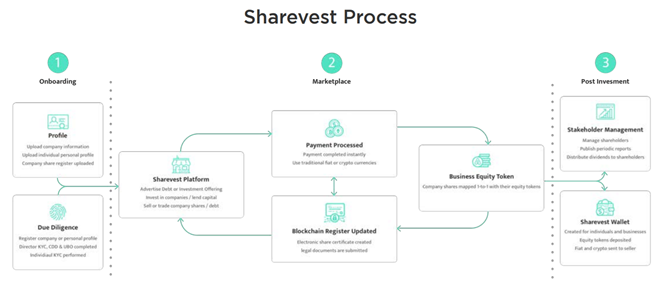 The Sharevest process goes simply like this: (1) Onboarding. In the Onboarding phase, profiles are created in which relevant information are uploaded. The users (companies or individuals) and the information entered will then go through Due Diligence to ensure everything are accurate and finally, the registration will be completed. (2) Marketplace. After registration and completion of the user profile, companies can now advertise debt or investment offering and then investing, sell or trade can now start. Under the marketplace, the payment processes will also start instantly with Blockchain Register updating as the process goes on. (3) The last phase is the Post Investment. In this phase, there's the Stakeholder Management where shareholders are managed, dividends are distributed, and periodic reports are published. Part of this phase includes the Sharevest Wallet. This E-wallet of Sharevest is entitled to be used by the individuals as well as the businesses to store equity tokens and send fiat and crypto to the seller.