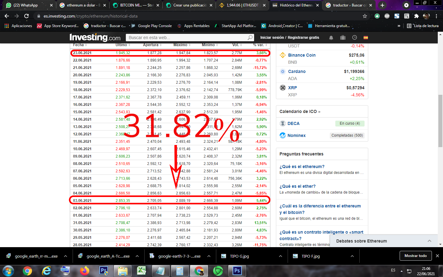 If we realize from 06/03/2021 to current date 06/22/2021, the cryptocurrency has had a decline of 31.82%