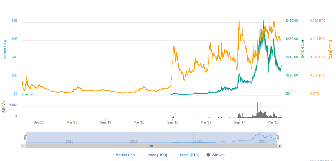 If we advance even further to late 2017, we can see Monero’s price surging (along most other cryptocurrencies at that time) to an All-Time-High of almost 475 USD in January 9th 2018.