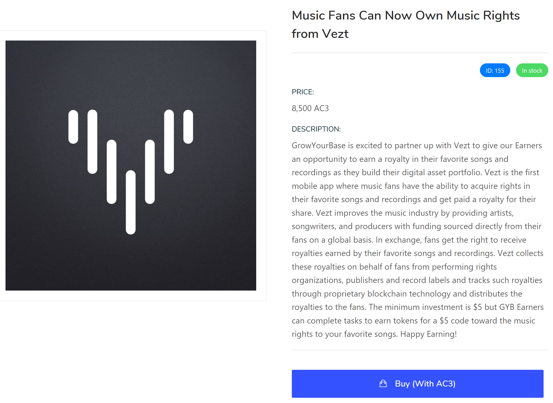 While that was a pretty neat concept to start off with, what they've done these past few months is nothing short of groundbreaking. GrowYourBase has created campaigns for projects that offer blockchain based digital assets, which can offer income streams or appreciate in value over time. Basically, earners are now spending time watching videos and learning about new projects that offer unique digital assets, and then receive AC3 tokens that can be used to buy those assets.