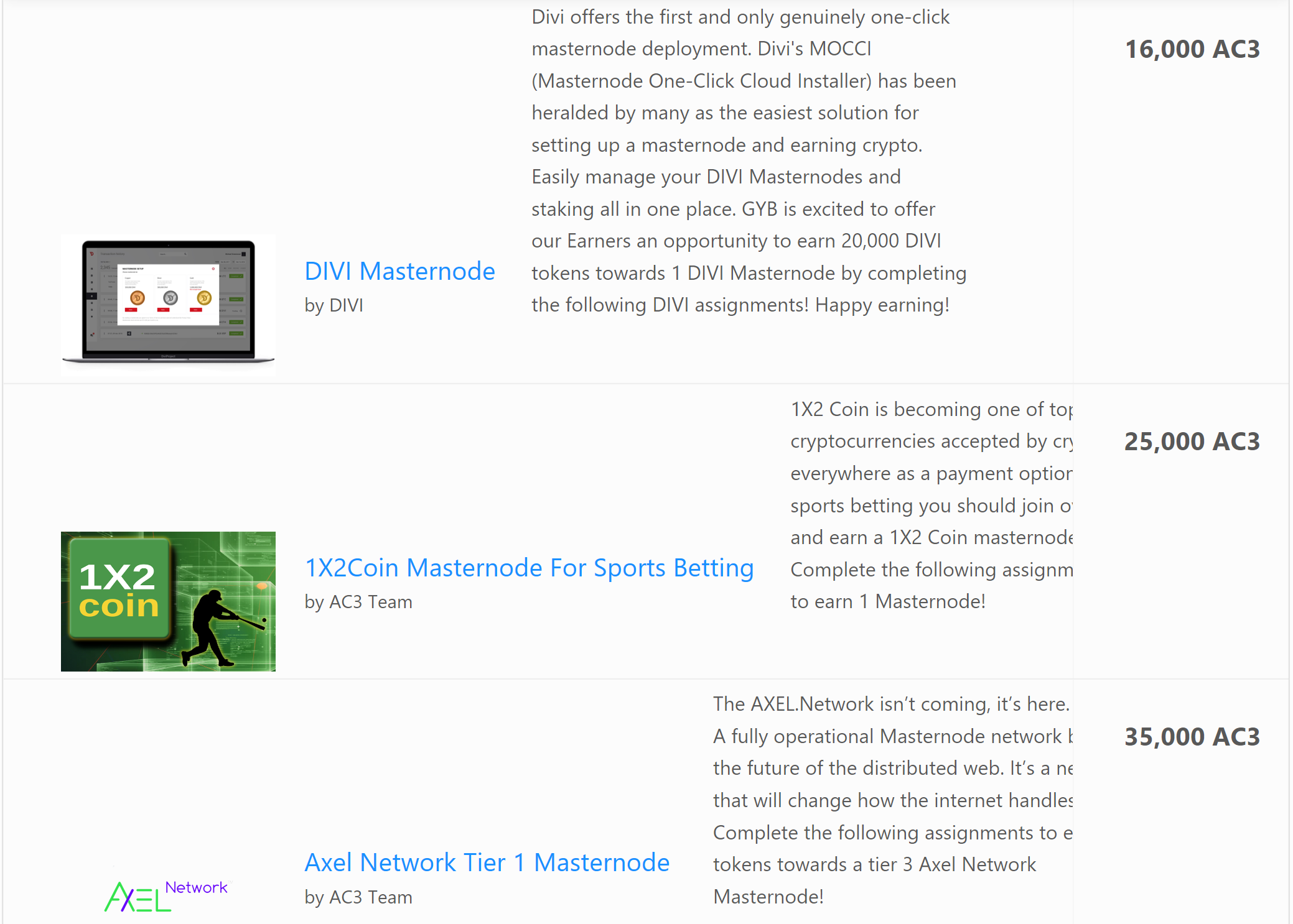 Masternodes: Divi, 1X2Coin, Axel and Bettex - Each of these campaigns allows earners to learn more about how masternodes work, while earning AC3 tokens that can be used towards their purchase or configuration of their very own.