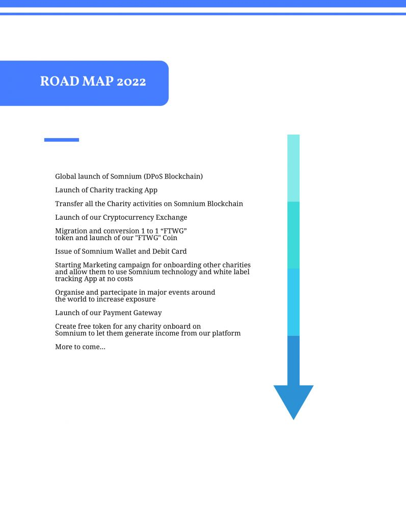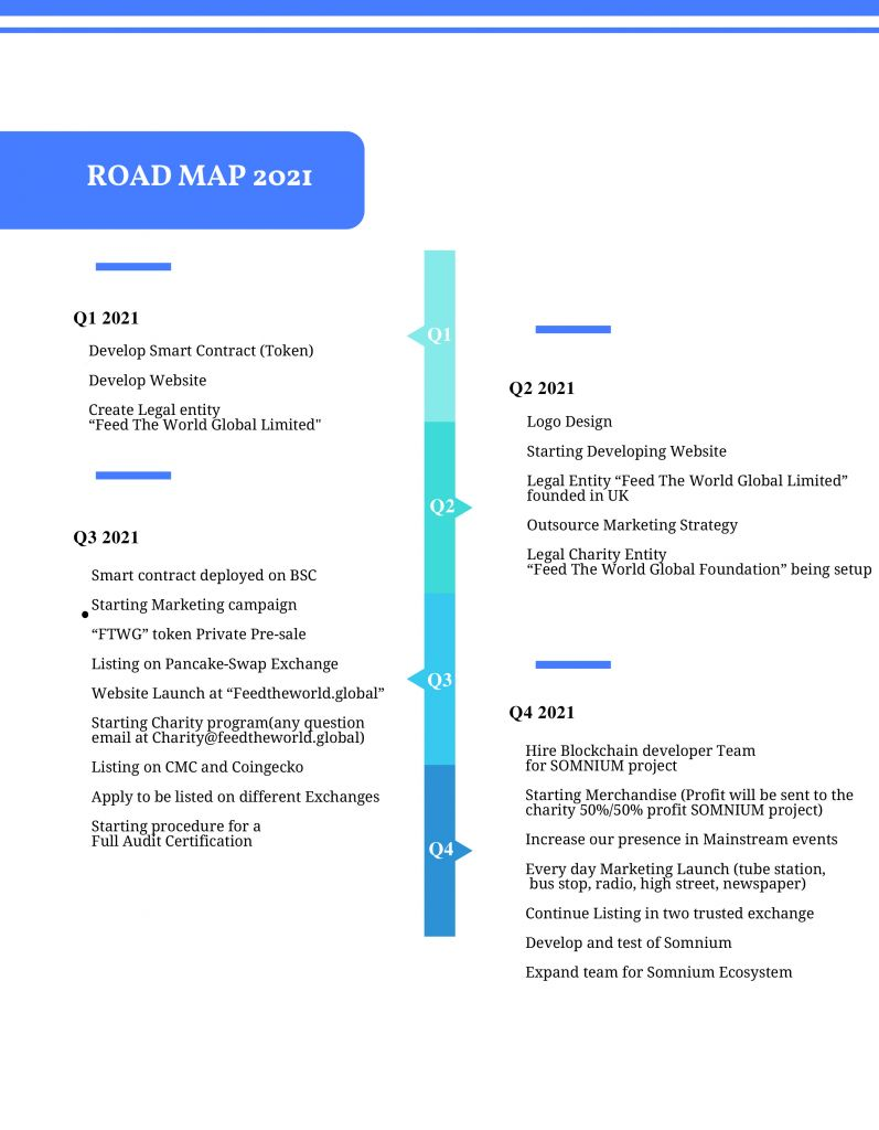 The first step in creating our ecosystem will be the launch of the “FTWG” token on Binance Smart Chain. This will make it possible to donate to our charity, “Feed the World Global Foundation”, the 1% derived from each transaction that will take place through our token. We also decided to thank our token holders with the reflection of 2% resulting from each transaction. All this will allow us to complete the development of SOMNIUM, Blockchain with proprietary technology (DPoS), which will allow us to start a long-lasting path by giving economic stability to the charity. Immediately aſter the launch of SOMNIUM we will start the migration of our “FTWG” token from BSC to our blockchain, giving life to our coin. Each holder will receive coins for the same value of tokens owned, thus being able to use them in our Ecosystem