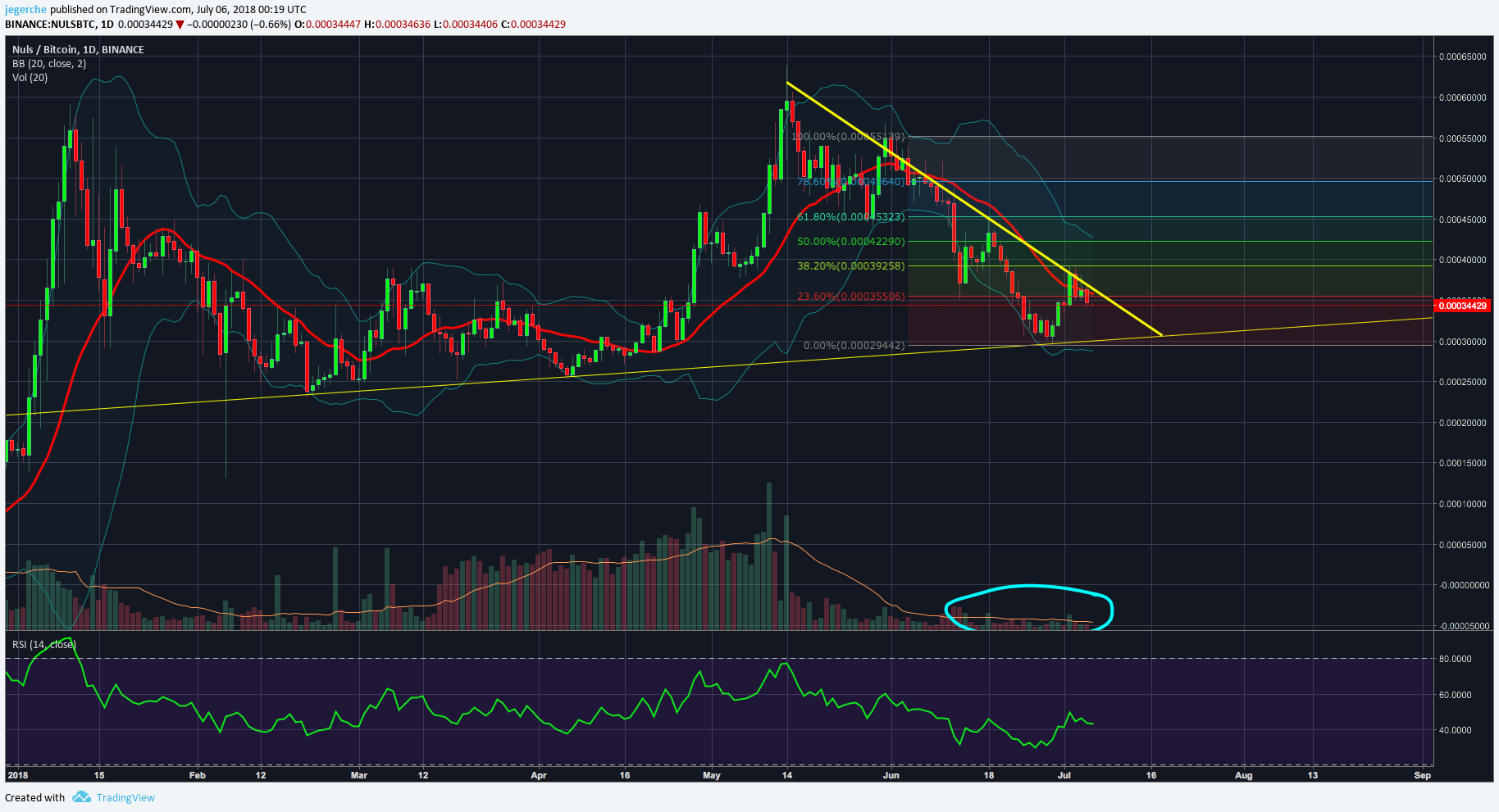 Basically, looking at both charts we can clearly see that NULSBTC is retracing right now and will have a bigger bounce after this retracement. One major indicator for this is also the volume, or better said the lack of volume. Whenever NULSBTC will get a lot of volume again, we will see pretty nice pushes. Right now the volume is crashed and is looking for a "revival" ideally at the bottom the of the uptrend support.