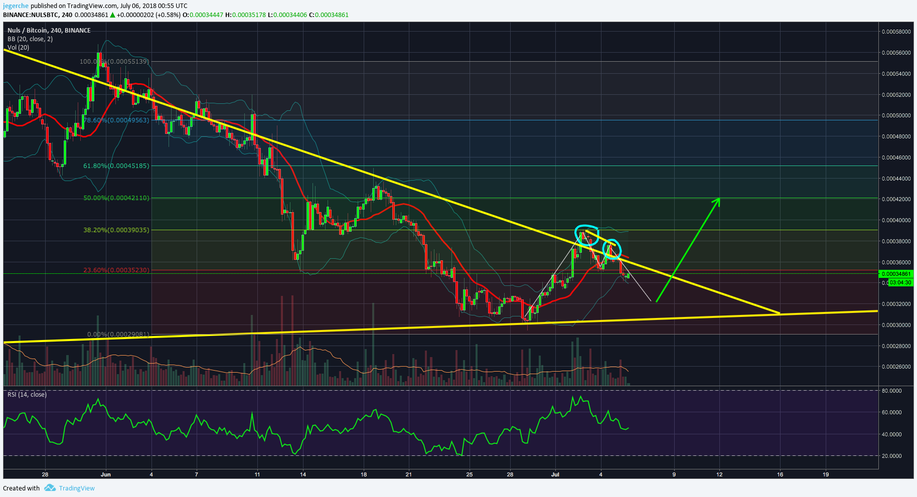 Nevertheless, there is a chance that NULSBTC will not retrace completely to the support line and bounce even earlier. This would also mean on RSI that the mentioned double bottom would be at 31 points and not at 20 points.