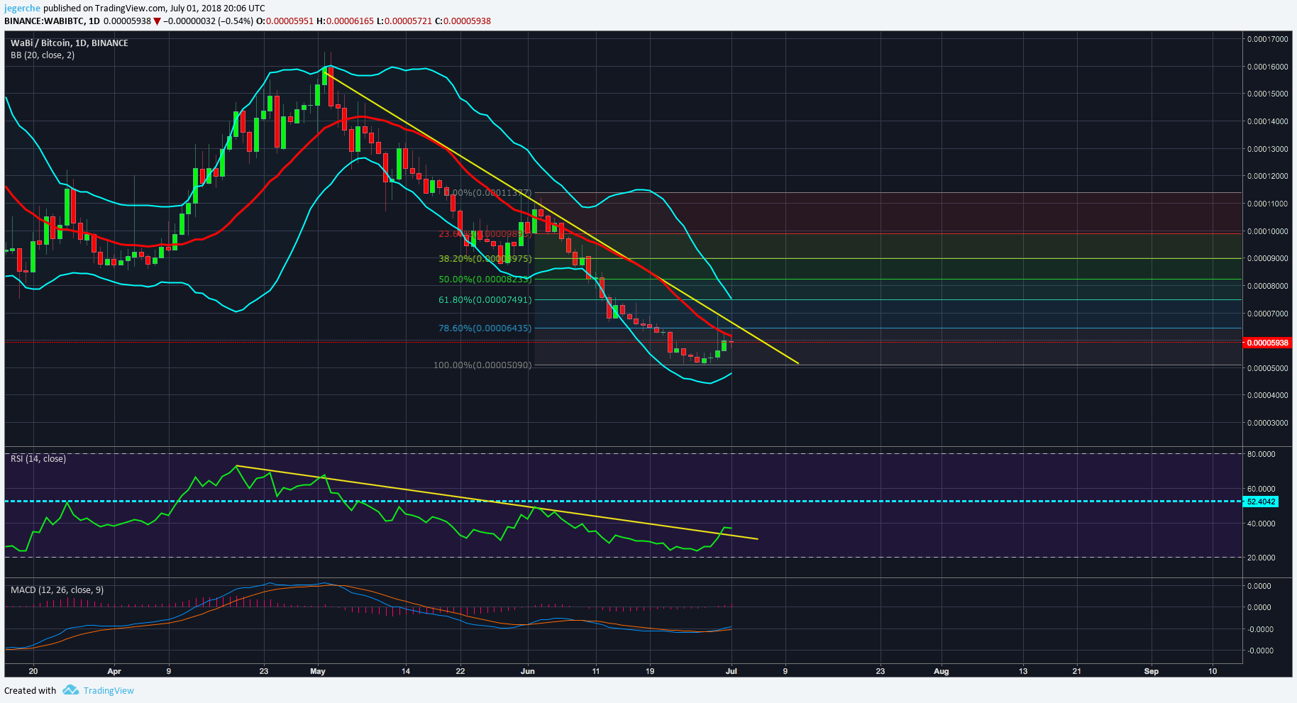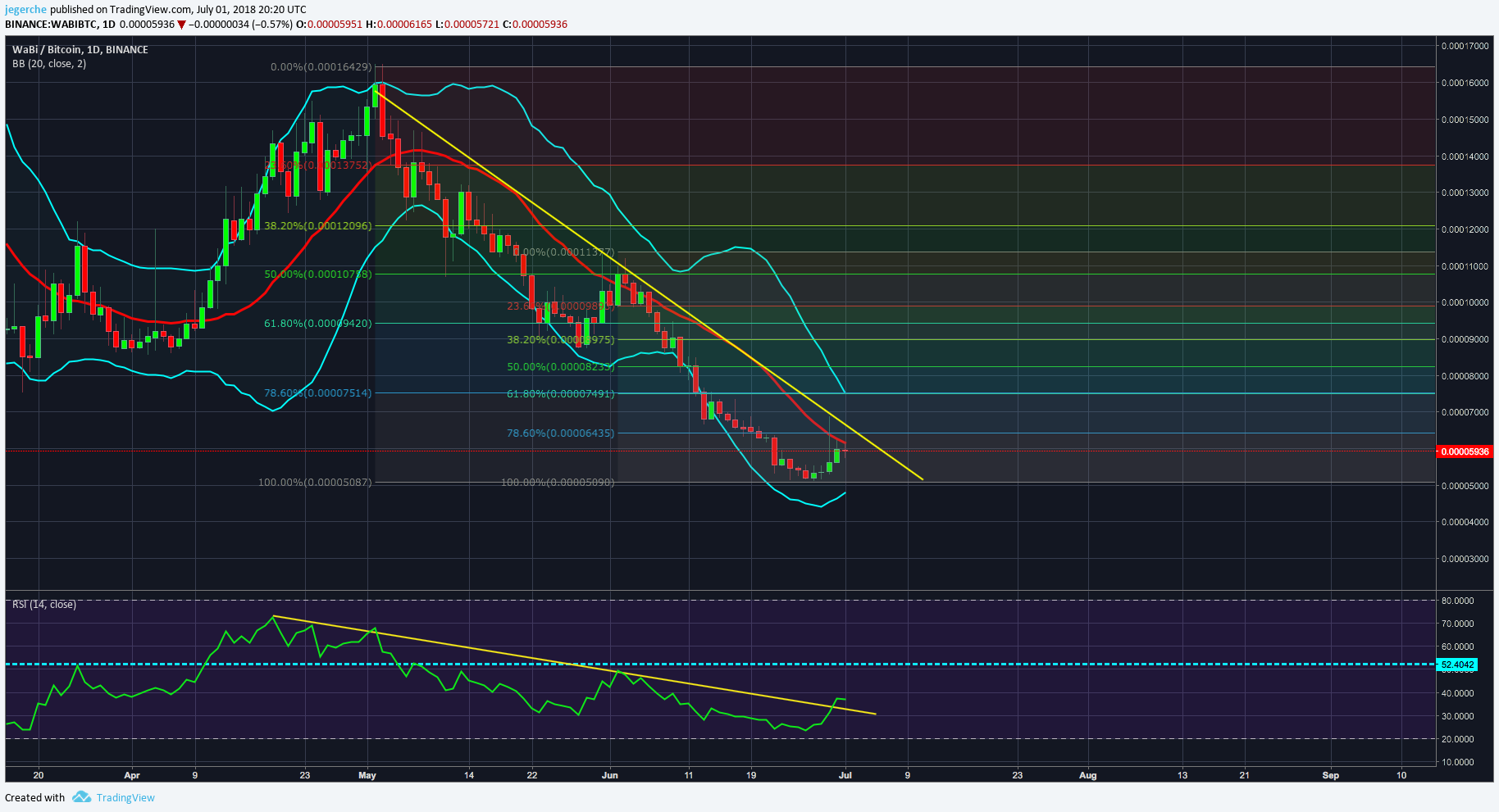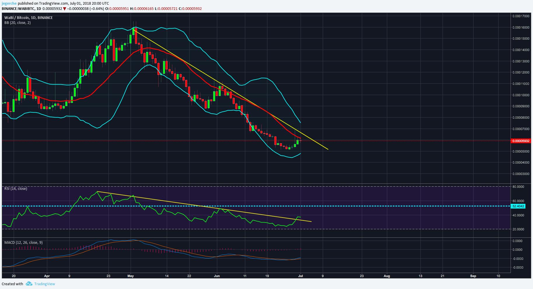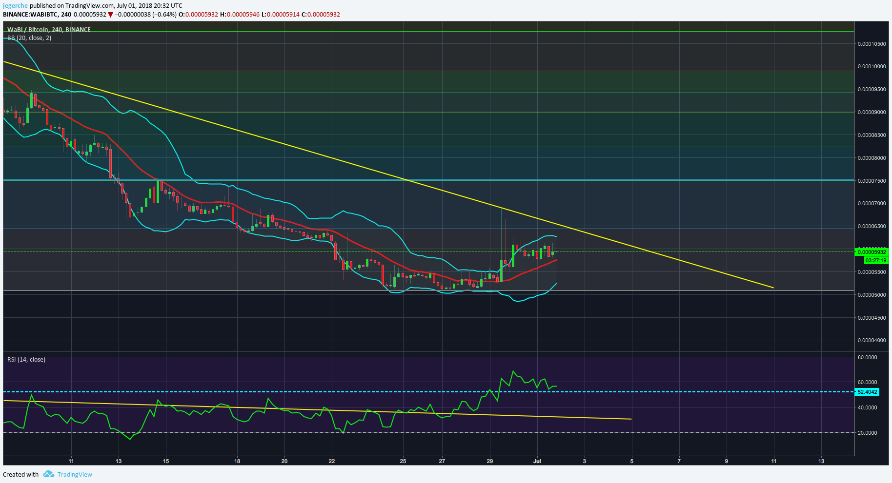 WABIBTC has been in a steady downtrend and staying pretty constant under the middle of the Bollinger Bands. As the distance between the chart and the middle line got too big around 5 days ago, WABIBTC has started its increase towards it again. During this increase we have seen one day of literally rocketing but of course that has not continued and looking at the daily the candle still closed in a normal manor.
