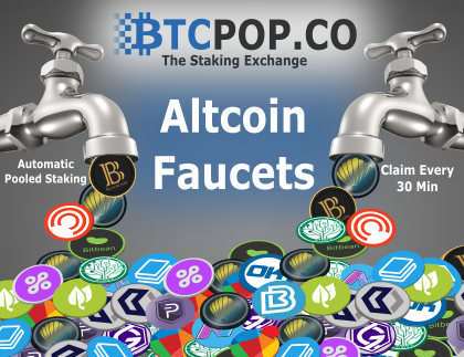 Btcpop.co home of "The Staking Exchange" has become a leader in the POS Staking Pool community.Btcpop's Staking Pool is growing every day and we want to thank our dedicated users for staking with us.If you are interested in getting started proof of stake mining head on over to Btcpop's POS Altcoin Faucet and get started today risk free!
