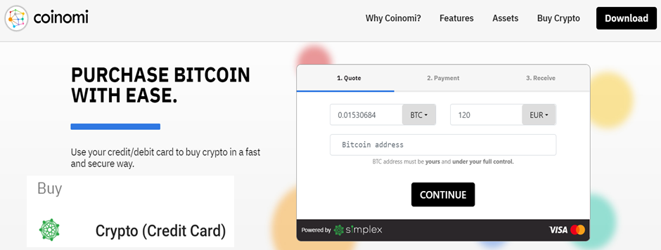 It is also possible to purchase cryptocurrencies on Coinomi with a credit or debit card through a third party payment processing platform known as Simplex. Clicking on the Buy Crypto option brings users to the Coinomi website where supported cryptocurrencies can be purchased using USD or EUR. A minimum transaction of USD50 is required with a daily limit of USD20,000 for purchases.