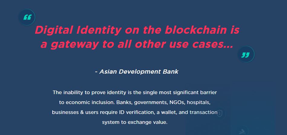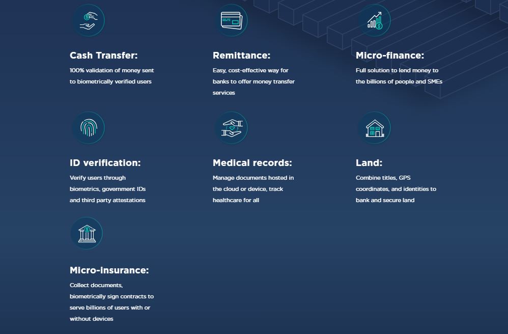 The inability to prove identity is the single most significant obstacle to the progress of the economic segment. Banks, governments, NGOs, hospitals, businesses and users require an identity check, a wallet and a transaction system to perform the necessary transactions.