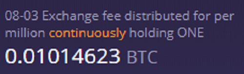 Price of ONE Token is 0.00612 USD at moment of writing. That means that for 1 million ONE Tokens you have to pay 6120 USD. Current daily dividend that you get for holding 1 million ONE Tokens is 0.01014623 BTC. At current BTC price of 7450 USD you get around 75.5 USD daily in various tokens! That is 1.23% daily ROI! Looks really SCAMMY...
