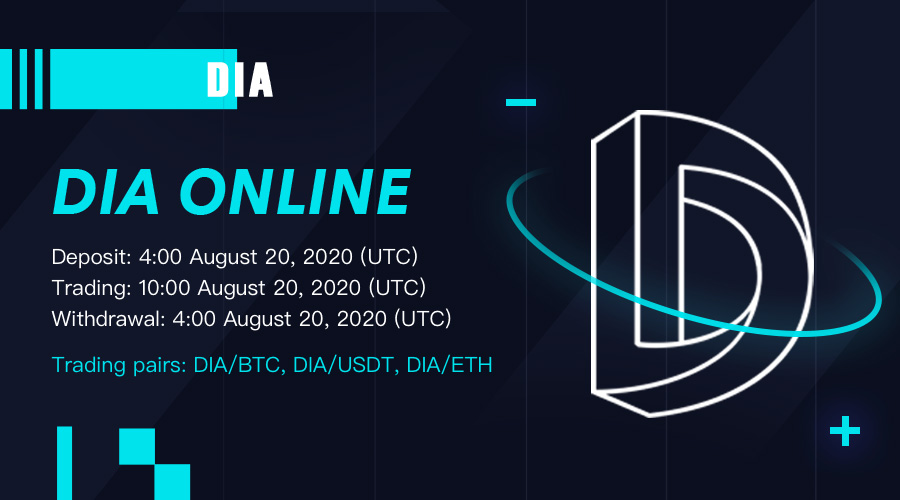 CoinEx will list DIA and support deposit on August 20, 2020 (UTC). And its trading pairs DIA/BTC, DIA/USDT, DIA/ETH will be available on the same day.